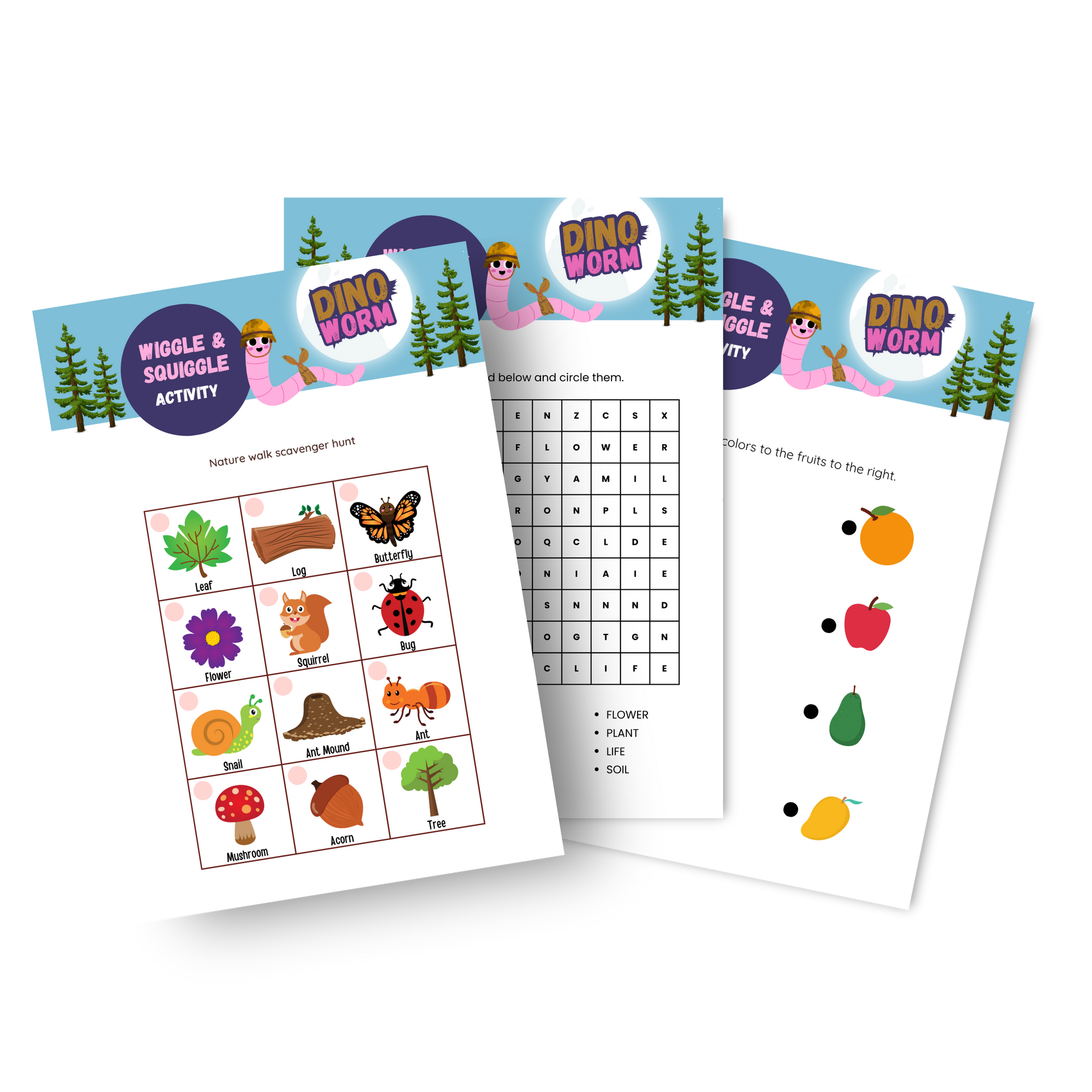 Step into a world of wiggly fun with the Wiggle & Squiggle Activity Pack! Inspired by the adventures of Dino Worm, this exciting activity set is packed with colouring pages, puzzles, games and creative challenges that invite children to join Dino Worm and his burrow friends on their brave and funny adventures.