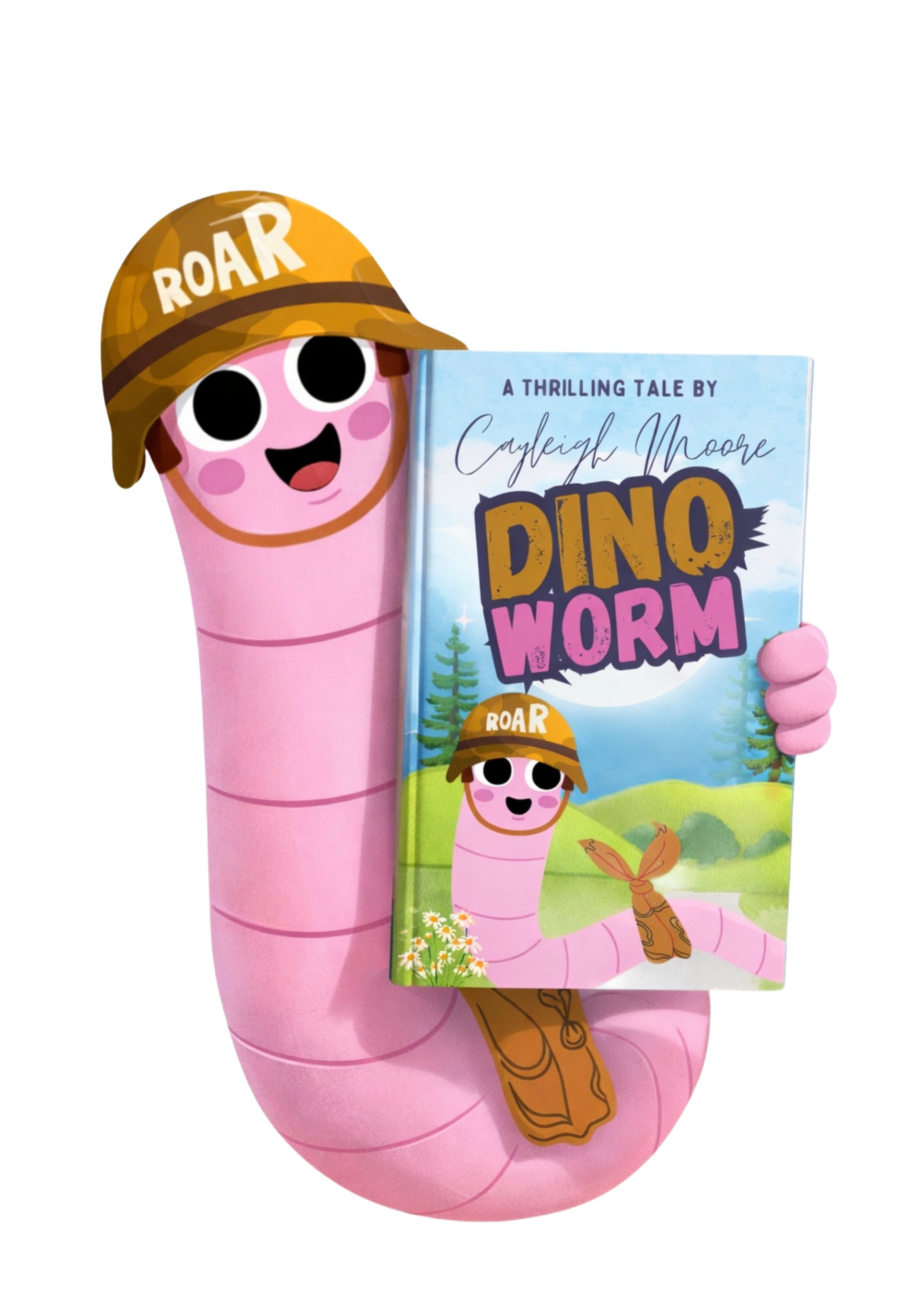 He’s a small, wiggly worm who lives deep in a busy little burrow underground. On his head sits a slightly dented army helmet with the word “RAWR!” scribbled across the front. On his side is a glittery bandage that sparkles whenever the light catches it. And inside his tiny worm body is something even bigger than a dinosaur’s roar, a huge, brave heart. Dino Worm may not have sharp teeth or giant claws, but he has something much more powerful: kindness, courage, and a wonderfully weird imagination.
